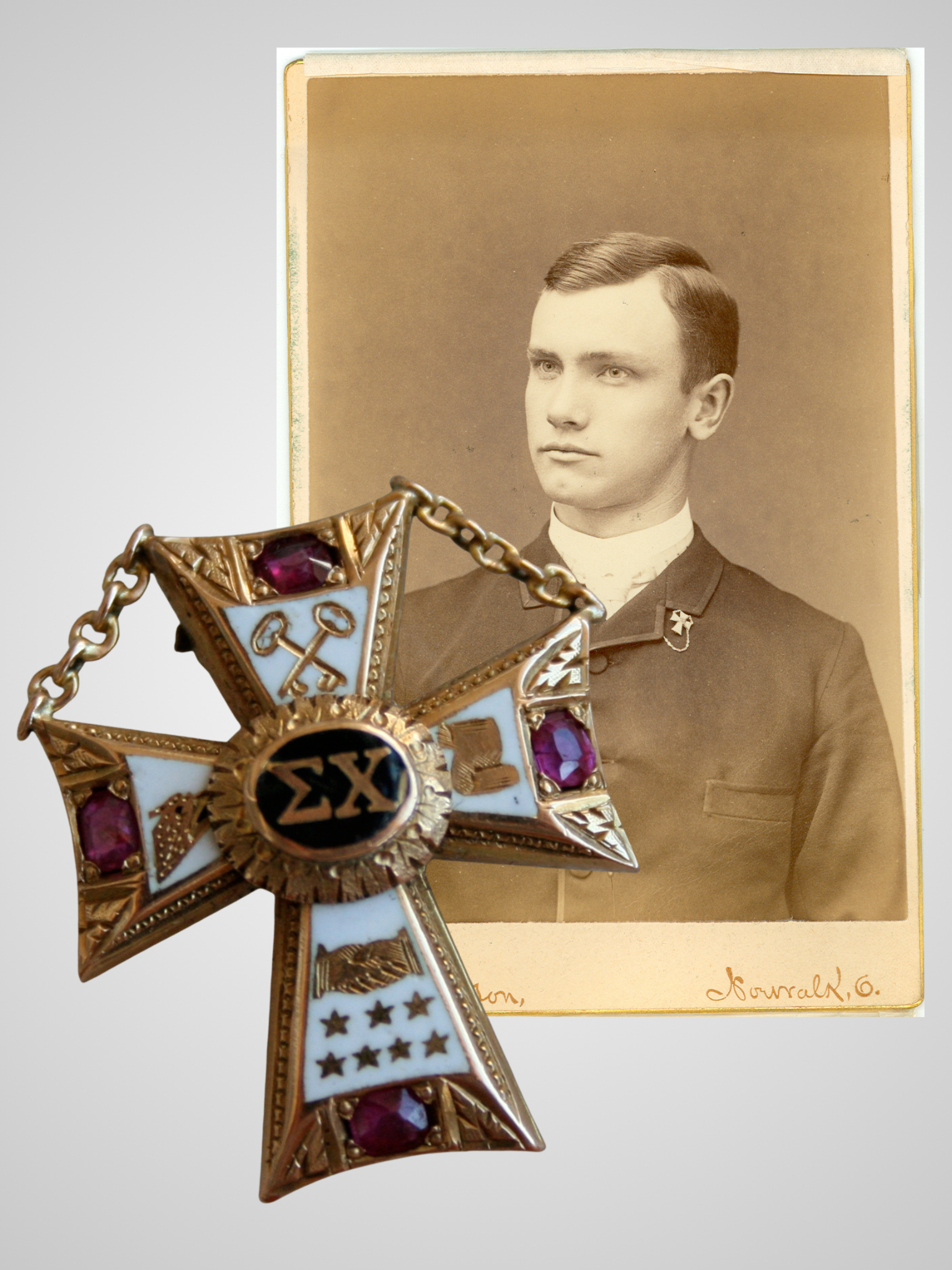 A few weeks into the semester, I needed a break. I found an antique flea market about 100 miles north of Cincinnati and made plans to go. Searching up and down the aisles of dealers, I saw some interesting things. That was until ... I saw it! Larger than modern badges, jeweled with rubies, it honestly took my breath away. I asked the seller to see the pin, and his first words to me were, “Are you a Sigma Chi? Because I will only sell it to a Sigma Chi.” I immediately confirmed my membership, and I was then holding this treasure in my hand. The dealer was Hank Spangenberger, BOWLING GREEN 1958. “How much?” I asked. He replied, “$100.” I thought that was a bit steep, but I had no choice but to pay it. It has been in my possession ever since. The badge originally belonged to Edwin E. Sheffield, DENISON 1887. I was lucky to also find a photo of him wearing the badge, adorned with a chapter guard that was long gone when I bought the badge.