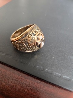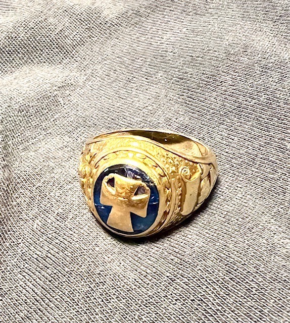 I was studying in France when my ring arrived at home in St. Louis. My parents sent it to me, but I had to go to Marseille to get it from Customs. Trying to explain what the ring meant took a little doing in French to the Customs office. He finally gave up and charged me $40 customs duty, and I got it. That was in 1967, and I still have it. The gold has expanded and covers some of the symbols, but I am still very proud to have it.