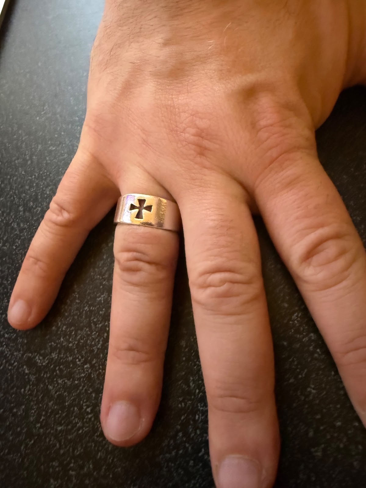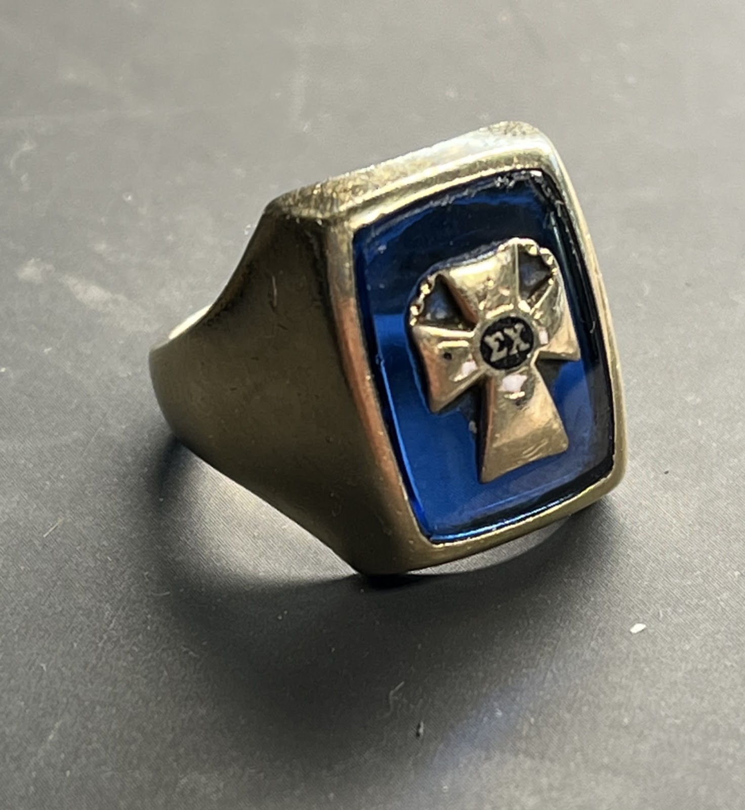 I had been hoping to buy the official Sigma Chi White Cross ring, but I was still in college, and it wasn't really affordable. Instead, I always kept an eye out for a ring that looked close enough to the real thing. I found my "faux" ring in December 2002 while killing time before an interview for an internship at the National Endowment for the Arts in Washington, D.C. I wore it during the interview and every day since. I got the internship, which led to my first job out of college (also at the Endowment), which in turn led to all of my subsequent jobs in the arts. So, I definitely think of the ring as a good luck charm.