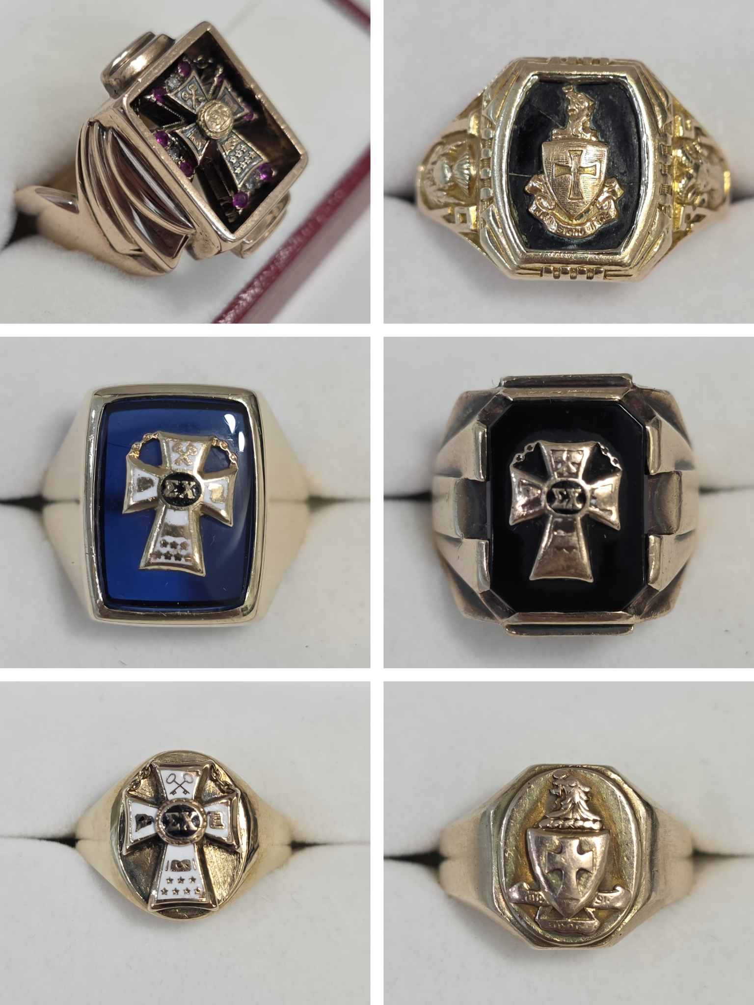 I have several Sigma Chi rings, mostly vintage. The first was made in 1915 and is inscribed with the owner's initials and the dates inside in very elaborate calligraphy. The next one was made in the 1930s and features an Art Deco style with small diamonds and rubies surrounding the cross. The next one was made in 1947 and was purchased from the family of the original owner. You can see by the worn patina on the cross that this gentleman wore it every day. This is the ring that I wear most often. The next one was produced in the 1950s and is a very simple design. Lastly, the ring with the blue stone is from Balfour and was made in 1966. It was passed on to me by a dear friend, Order of Constantine Sig Danny Nelson, WYOMING 1969, who served as chapter advisor to the Wyoming chapter for 31 years. He sent it to me just before his recent passing, and I am honored to be its caretaker now. The last ring, I bought it from a gentleman who owned it for 25 years and never wore it. I asked him if he knew when it was made and he had no idea. I got to looking at the photos of it more closely and discovered a 19 on one side and a 35 on the other. Mystery solved.